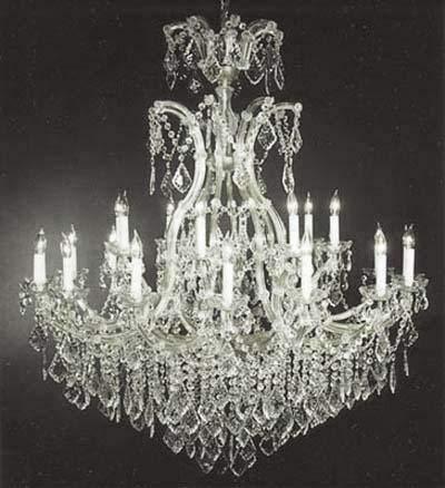 This beautiful Chandelier is trimmed with Empress Crystal(TM) Maria Theresa 100% Crystal Chandelier. A great European Tradition. Nothing is quite as elegant as the fine crystal chandeliers that gave sparkle to brilliant evenings at palaces and manor houses across Europe. This two-tier version from the Maria Theresa collection is decorated with 100% crystal that capture and reflect the light of the candle bulbs, each resting in a scalloped bobache. The timeless elegance of these chandeliers is sure to lend a special atmosphere in every home. Please note this item requires assembly. This item comes with 18 inches of chain. SIZE: HT 52 X WD 46 LIGHTS: 24 LIGHTS
